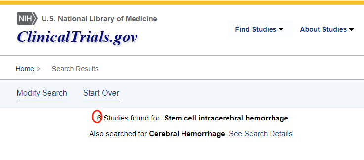 截至2022年12月5日,在美國國立衛(wèi)生研究院的最大臨床試驗(yàn)注冊庫clinicaltrials.gov網(wǎng)站上注冊的有關(guān)干細(xì)胞治療腦出血的臨床研究項(xiàng)目有6項(xiàng)。