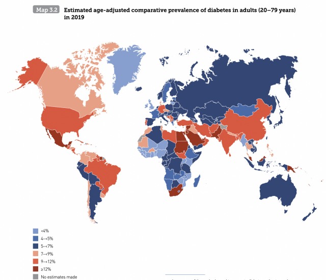 一個(gè)國家和另一個(gè)國家的糖尿病患病率差異很大。以下是按國家劃分的年齡調(diào)整后糖尿病患病率地圖:
