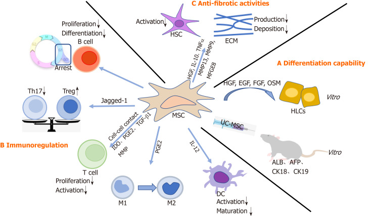 B:MSCs 調(diào)節(jié)先天性和適應(yīng)性免疫系統(tǒng)的效應(yīng)細(xì)胞;