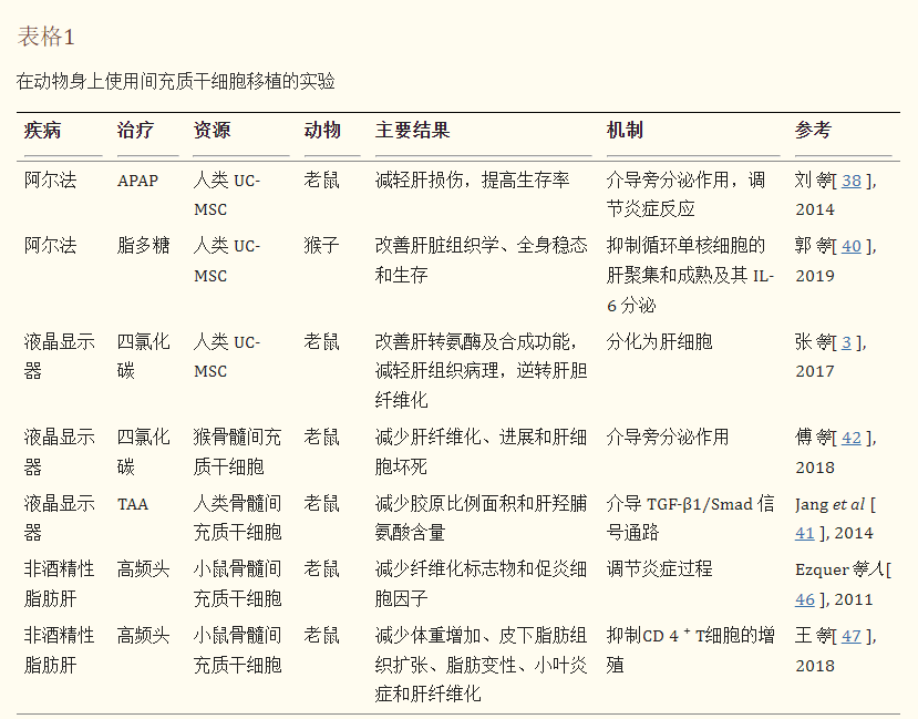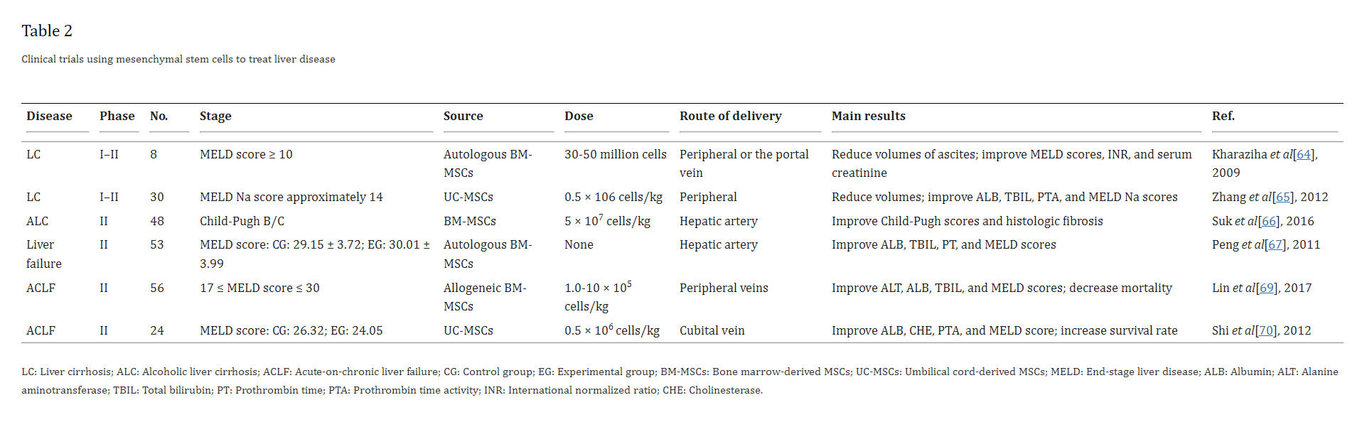 已經(jīng)啟動(dòng)了許多臨床研究來(lái)研究間充質(zhì)干細(xì)胞在治療肝臟疾病中的治療潛力。表中總結(jié)了有關(guān)間充質(zhì)干細(xì)胞移植治療肝病的主要發(fā)現(xiàn)表2。