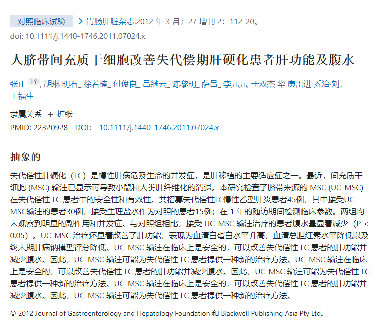 2012年,北京302醫(yī)院在另一項(xiàng)I–II期臨床試驗(yàn)中,Zhang等人將45例慢性乙型肝炎導(dǎo)致的失代償性肝硬化患者隨機(jī)分為兩組:30例接受UC-MSC輸注,15例接受生理鹽水作為對(duì)照組。與對(duì)照組相比,接受MSC治療的患者腹水量和血清肝硬化標(biāo)志物水平顯著降低。重要的是,UC-MSC輸注可以改善肝功能,這可以通過(guò)ALB增加而 TBIL、凝血酶原時(shí)間活性 (PTA) 或 MELD-鈉 (MELD-Na) 評(píng)分降低來(lái)證明。值得注意的是,MELD-Na評(píng)分已被證明是肝病預(yù)后較好的標(biāo)志物。