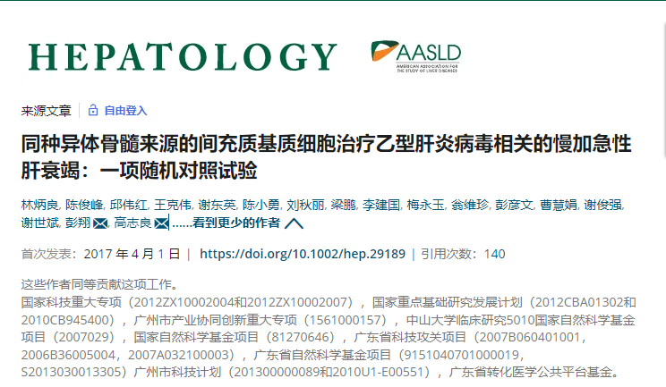 2017年,廣州市中山大學(xué)附屬第三醫(yī)院感染科在一項(xiàng)試驗(yàn)中,同種異體BM-MSC移植被用于HBV相關(guān)ACLF患者:56名患者每周輸注1-10×105個(gè)細(xì)胞/kg同種異體BM-MSC,持續(xù)4周,而54名患者接受標(biāo)準(zhǔn)藥物治療作為對(duì)照組。有趣的是,同種異體BM-MSC治療可以顯著改善實(shí)驗(yàn)室參數(shù),例如 ALT、ALB、TBIL和MELD 評(píng)分。更重要的是,多器官衰竭和嚴(yán)重感染的死亡率顯著降低。