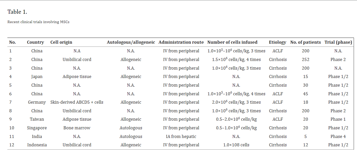 此外,為了描述以MSC為導(dǎo)向的臨床試驗(yàn)的最新趨勢(shì),我們根據(jù)ClinicalTrials.gov(表格1). 其中大部分在亞洲國(guó)家注冊(cè)。研究在細(xì)胞來(lái)源、自體與同種異體性質(zhì)以及肝硬化的病因?qū)W方面各不相同。然而,在大多數(shù)研究(12項(xiàng)中的11項(xiàng))中,MSC給藥是通過(guò)外周注射每劑約1×106MSC/kg。研究不僅關(guān)注肝硬化,還關(guān)注急性慢性肝衰竭 (ACLF)。由于MSCs在炎癥期間表現(xiàn)出更強(qiáng)的治療效果,因此它們?cè)贏CLF的情況下可能特別有效??偠灾?,許多面向MSC的臨床試驗(yàn)尚未超過(guò)I期或II期。