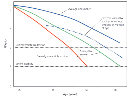 25歲以后,不吸煙的成年人的一秒用力呼氣量 (FEV1) 平均每年減少20至40毫升。在一些吸煙者中,F(xiàn)EV1降低了這個(gè)數(shù)量的兩到五倍,使他們特別容易患上慢性阻塞性肺病。戒煙可能會(huì)導(dǎo)致FEV1略有初始改善(第一年約為50mL)。更重要的是,戒煙可以使曾經(jīng)吸煙的人與從不吸煙的人一樣平均持續(xù)喪失肺功能。圖1說(shuō)明了肺功能在各種情況下的逐漸喪失。