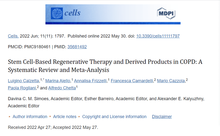 2022年5月,意大利帕爾馬大學(xué)的研究團(tuán)隊在《Cells》雜志上發(fā)表了基于干細(xì)胞的再生療法以及衍生產(chǎn)品對慢性阻塞性肺?。–OPD)患者的療效情況,這項研究分析了11項臨床研究,共提取了371名COPD患者的數(shù)據(jù)。結(jié)果表明基于干細(xì)胞的再生療法和衍生產(chǎn)品對COPD患者有著一定的治療效果。