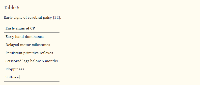 最近的一項(xiàng)研究表明,最常見(jiàn)的癥狀是在2歲之前使用單手,無(wú)法在適當(dāng)?shù)臅r(shí)間內(nèi)達(dá)到正常的里程碑,以及在一定時(shí)期后出現(xiàn)原始反射(表5) 。