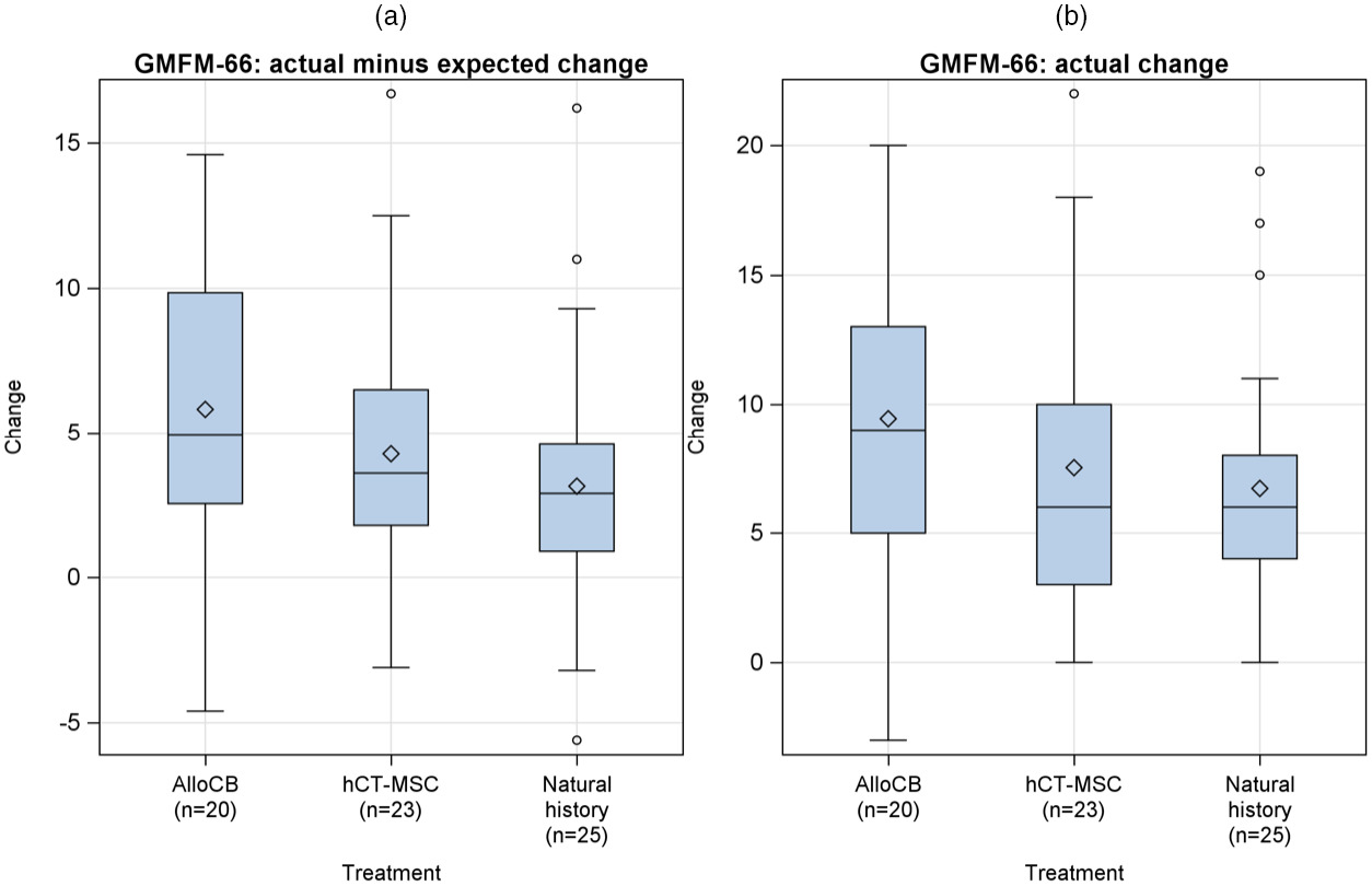 (a) 研究的主要結(jié)果是GMFM-66從基線到第12個月的實際減去預(yù)期變化。平均變化(和95%置信區(qū)間)為 5.8 (3.4–8.2)、4.3 (2.2–6.4 ),同種異體臍帶血 (AlloCB)、人臍帶組織來源的間充質(zhì)基質(zhì)細(xì)胞 (hCT-MSC) 和自然歷史臂分別為 3.1 (1.4–5.0)。