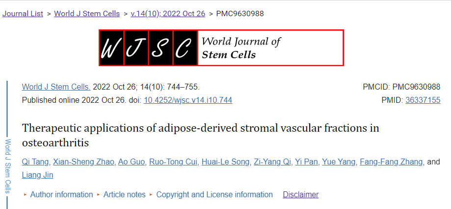 參考資料:Tang Q, Zhao XS, Guo A, Cui RT, Song HL, Qi ZY, Pan Y, Yang Y, Zhang FF, Jin L. Therapeutic applications of adipose-derived stromal vascular fractions in osteoarthritis. World J Stem Cells. 2022 Oct 26;14(10):744-755. doi: 10.4252/wjsc.v14.i10.744. PMID: 36337155; PMCID: PMC9630988.