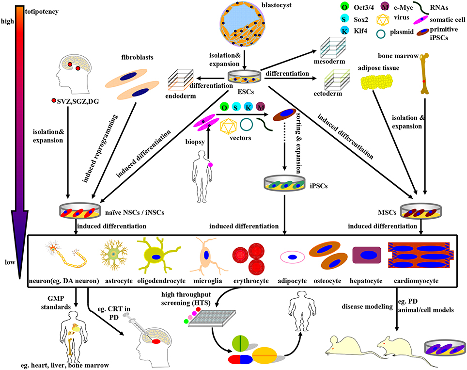 上述干細胞可分為ESCs、NSCs、MSCs和iPSCs四大類,伴隨著逐漸下降的全能性。
