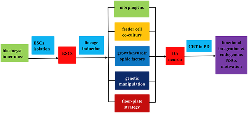 整個過程分為以下三個步驟: (1) 從胚泡內塊分離胚胎干細胞;(2) 通過 (i) 應用形態(tài)發(fā)生素或可溶性生長因子誘導ESC分化為DA神經元;(ii) 飼養(yǎng)細胞共培養(yǎng);(iii) 遺傳操作;(iv) 底板譜系誘導策略;(3) 通過功能整合和內源性NPCs動機在PD治療中移植誘導的DA神經元。