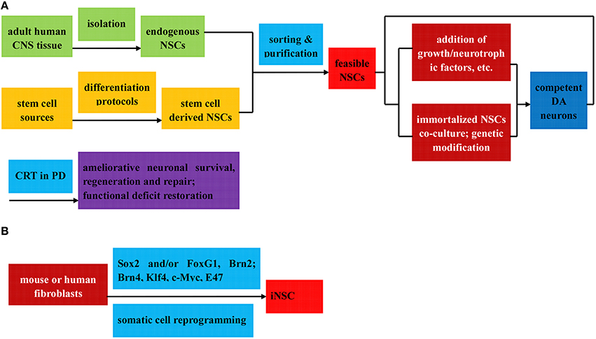 PD是一種與衰老相關的神經退行性疾病,被認為是受影響大腦區(qū)域NSCs池缺乏的結果,是CRT的合適候選者。因此,高度期待將NSCs(內源性 NSCs、iNSCs或干細胞衍生的神經干細胞)替換到受損大腦中作為PD的可能治療手段(見圖1)。在成功建立多種來源的神經干/前體/祖細胞 (NPC/NSC) 后,快速、可靠和長期生產人類 NPC 對神經科學家和臨床神經移植試驗都具有巨大的實用價值。