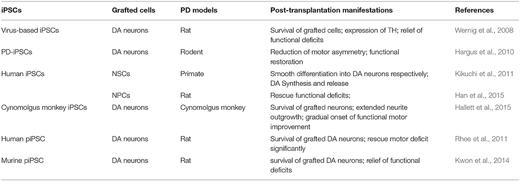 到目前為止,已有多項證據(jù)表明,源自ESC的富含DA的移植物在移植到PD動物模型后通常保持其DA誘導的表型、延長的神經突向外生長、表達突觸標記并產生相當大的行為恢復(見表1)。與PD動物模型的結果類似,接受人類胎兒組織移植的患者表現(xiàn)出運動缺陷顯著減少,移植物存活率、多巴胺釋放和DA神經元的突觸整合。