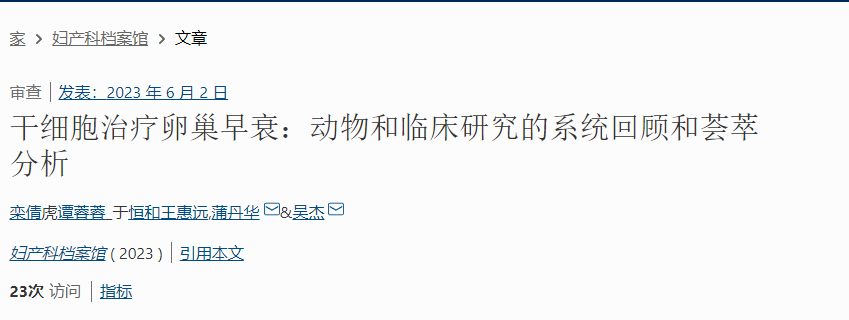 2023年6月,江蘇省人民醫(yī)院婦幼保健院南京醫(yī)科大學第一附屬醫(yī)院婦產(chǎn)科通過系統(tǒng)評價和薈萃分析評估干細胞療法在卵巢早衰小鼠模型和卵巢早衰患者中的療效。