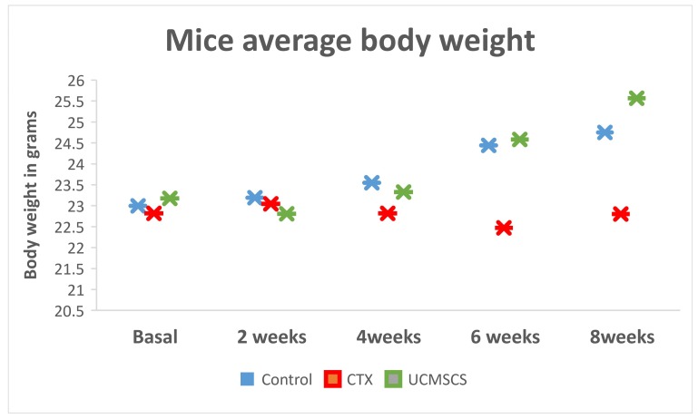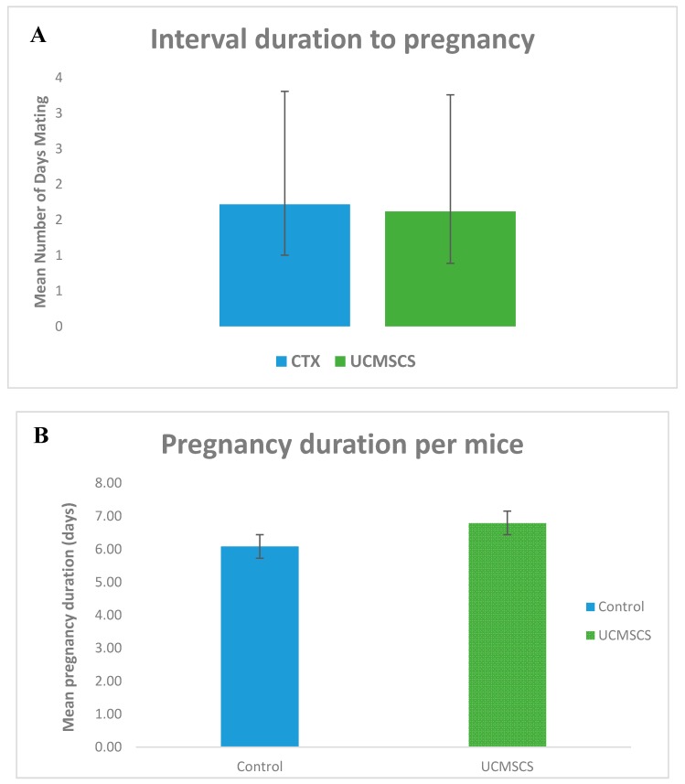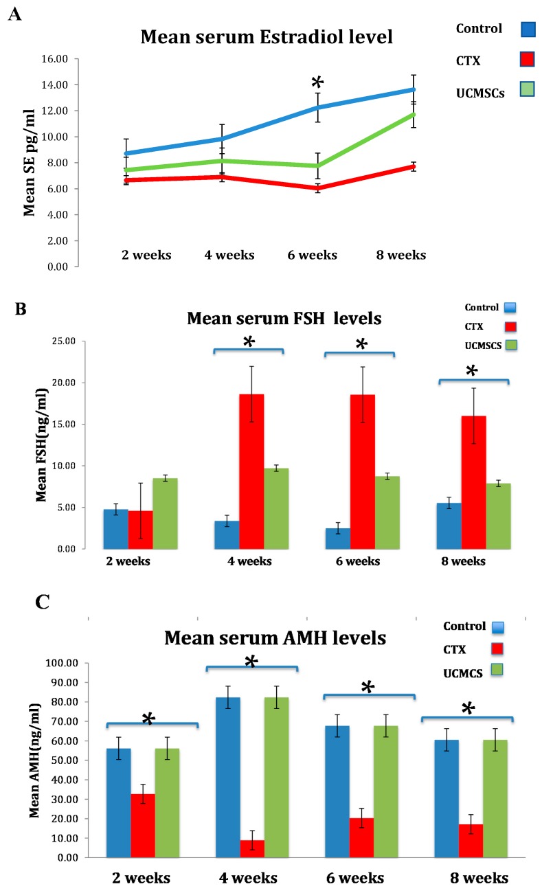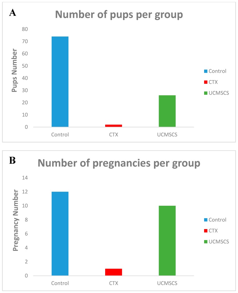 材料和方法:一項(xiàng)臨床前小鼠病例與載體對(duì)照隨機(jī)研究。三組中的每組都同時(shí)進(jìn)行了兩個(gè)實(shí)驗(yàn)。首先是證明UCMSCs恢復(fù)卵巢功能的能力。第二個(gè)是證明提高生育能力??偣?6只小鼠被隨機(jī)分配;6只小鼠分成3組,每組進(jìn)行2次實(shí)驗(yàn)。第1組(對(duì)照組)、第2組(假化療)、第3組(干細(xì)胞)。