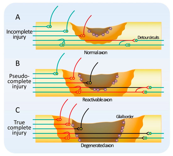 ( C ) 真正的完全傷害。無神經(jīng)組織(灰色)橫跨整個(gè)脊髓,在頭端或尾端對周圍可再激活組織的治療無法提供功能性顱骨連接。