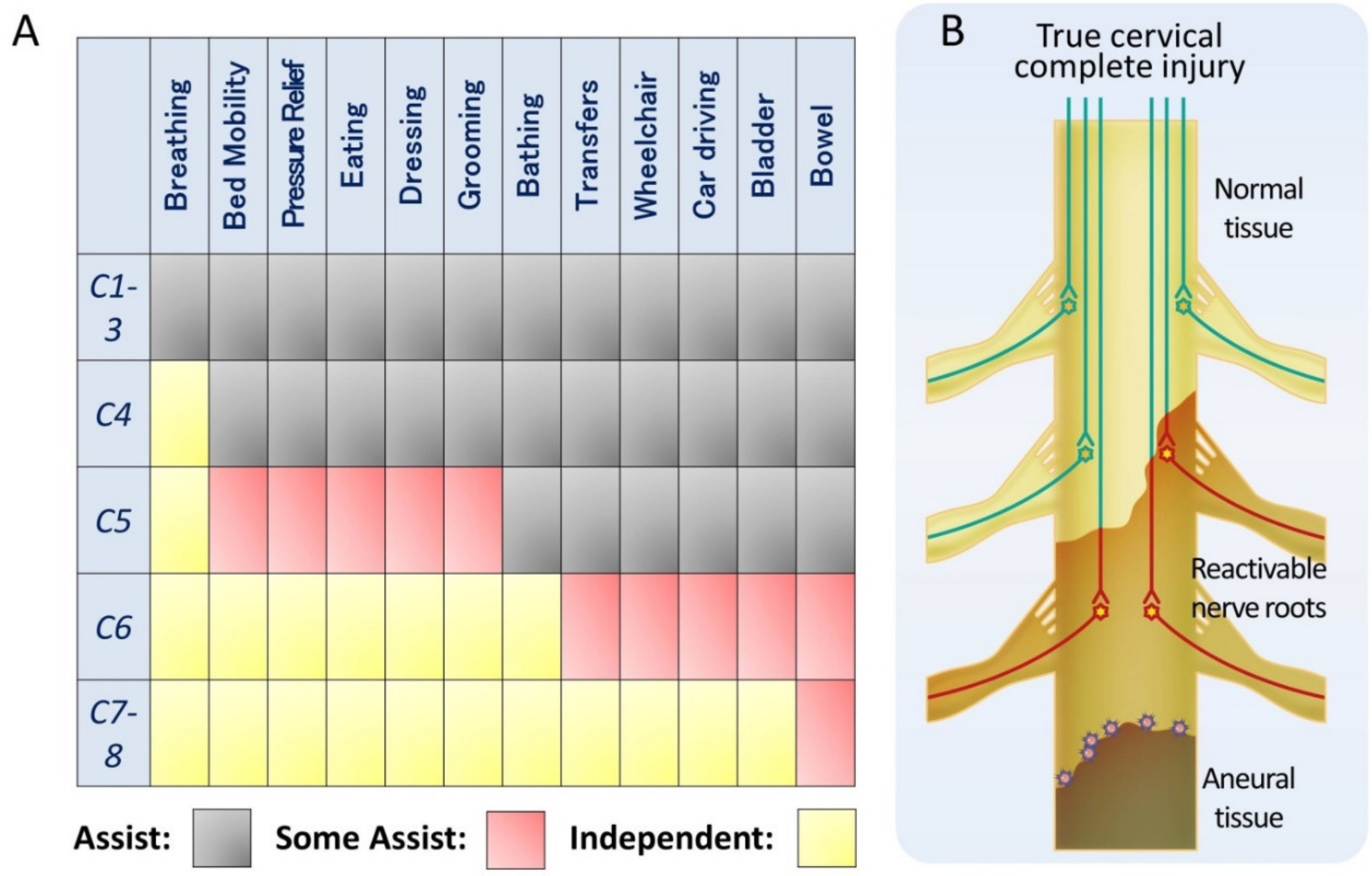 ( B ) 真正的完全性頸髓損傷。神經(jīng)區(qū)穿過脊髓(灰色),但它周圍的可再激活組織(淺棕色)仍然存在。隨著可重新激活的組織因干細(xì)胞治療而變得有功能,患者的ADL有望增加。