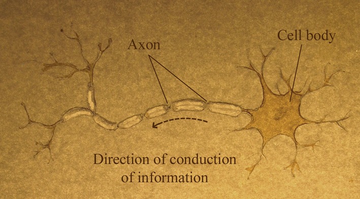 脊髓中發(fā)現(xiàn)的主要細(xì)胞類型,即神經(jīng)元,以電信號(hào)的形式在脊髓上下傳遞信息。軸突(也稱為神經(jīng)纖維)是神經(jīng)元的細(xì)長(zhǎng)投射物,可將這些信號(hào)從神經(jīng)元細(xì)胞體傳導(dǎo)出去。每個(gè)神經(jīng)元只有一個(gè)軸突,它可以和整個(gè)脊髓一樣長(zhǎng),在成年人身上可達(dá)45厘米。