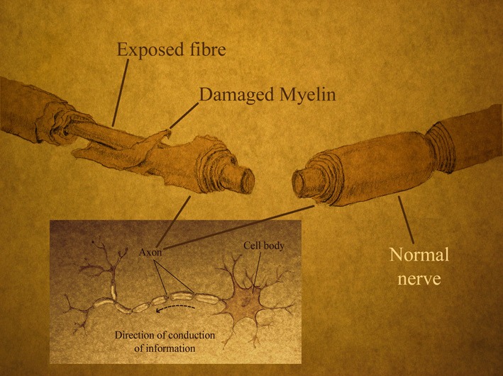 在細(xì)胞水平上,軸突被壓碎和撕裂,少突膠質(zhì)細(xì)胞(構(gòu)成軸突周圍絕緣髓鞘的細(xì)胞)開始死亡。暴露的軸突開始退化,這會(huì)破壞神經(jīng)元連接和信息沿脊髓的流動(dòng)。