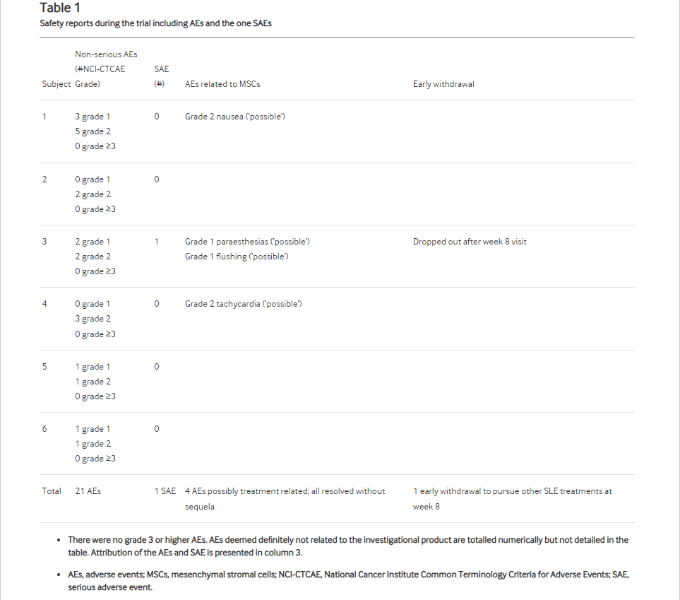 6名SLEDAI>6且標(biāo)準(zhǔn)護(hù)理治療失敗的女性接受了一次靜脈輸注1×106MSCs/kg 體重。他們維持目前的免疫抑制劑,但他們的醫(yī)生被允許最初調(diào)整皮質(zhì)類固醇以控制癥狀。臨床終點(diǎn)是SRI為4,沒(méi)有新的不列顛群島狼瘡活動(dòng)指南 (BILAG) As,并且在20周內(nèi)將潑尼松逐漸減量至10mg或更少時(shí),醫(yī)生總體評(píng)估評(píng)分沒(méi)有增加>0.3。