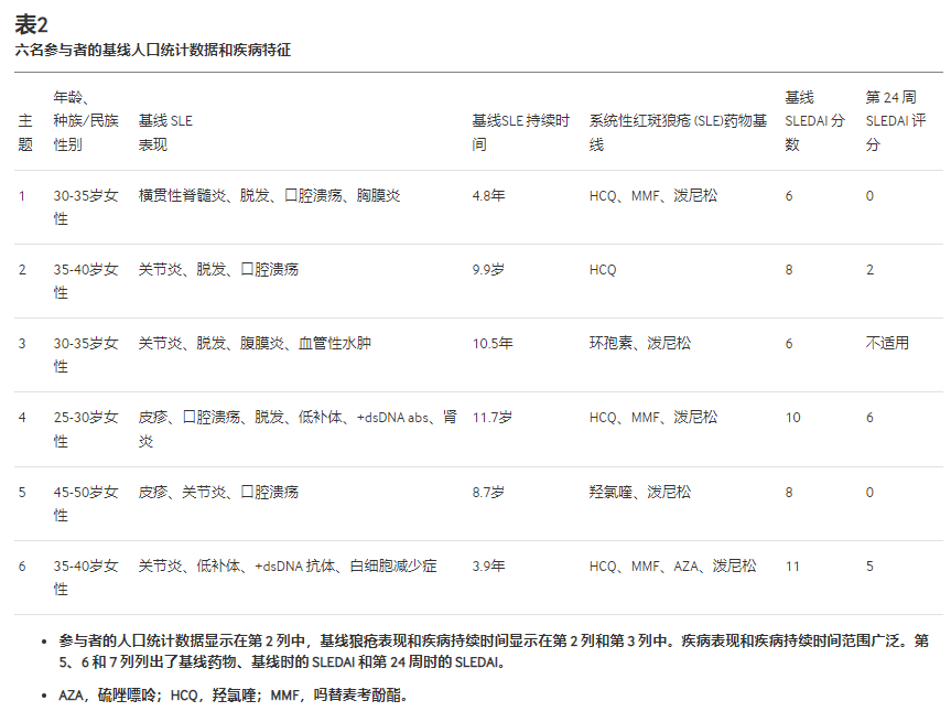 入組的6名患者均為女性,平均年齡38歲(范圍26-48歲)。兩名參與者是非裔美國(guó)人,一名是西班牙裔,三名是白人。平均病程為8.2年(范圍為3.9-11.7年)。一名患者在兒童時(shí)期發(fā)病?;€疾病特征見表2。盡管進(jìn)行了免疫抑制和生物治療,一名患者仍出現(xiàn)難治性橫貫性脊髓炎發(fā)作。一名患有腎臟疾病的患者在接受霉苯酯 (MMF) 治療后持續(xù)出現(xiàn)蛋白尿。除一名患者外,所有患者均服用羥氯喹和潑尼松。兩名患者使用MMF,一名患者使用硫唑嘌呤和MMF,一名患者使用環(huán)孢菌素。其中兩人因多次免疫抑制治療方案失敗而未服用免疫抑制劑。在整個(gè)試驗(yàn)過(guò)程中,所有患者均繼續(xù)接受基線藥物治療。