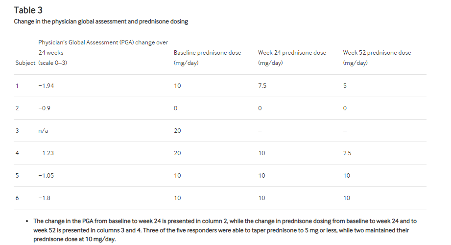 從24周到52周,5名應(yīng)答者的臨床應(yīng)答穩(wěn)定或進(jìn)一步改善(圖1A和在線補(bǔ)充表1)。5/6名應(yīng)答者的醫(yī)生和患者總體評(píng)價(jià)均有明顯改善(表3和數(shù)據(jù)未顯示)。潑尼松可逐漸減少或維持在每天10毫克或更少(表 3)。LIT有持續(xù)的反應(yīng)(圖1C)。隨后,在研究結(jié)束后的18到48個(gè)月期間,有四名患者的病情復(fù)發(fā)?;颊?1在輸液后20個(gè)月時(shí)胸脊髓橫貫性脊髓炎復(fù)發(fā)。她接受了賽妥生(Cytoxan)和清除術(shù)治療,并用間充質(zhì)干細(xì)胞進(jìn)行了再治療。34個(gè)月后,她的病情沒(méi)有復(fù)發(fā)。其他三位參與者的關(guān)節(jié)炎和皮膚病復(fù)發(fā)程度較輕,但沒(méi)有接受間充質(zhì)干細(xì)胞治療。