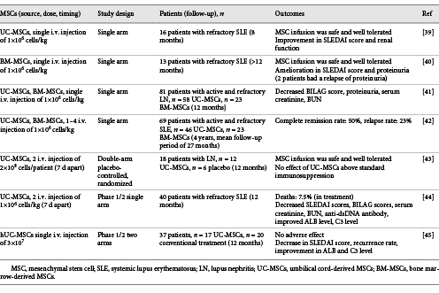 Lazarus等人進(jìn)行了MSC治療的第一個(gè)I期試驗(yàn)證明了15名患者志愿者離體培養(yǎng)擴(kuò)增和自體BM-MSC靜脈輸注的安全性。從那時(shí)起,間充質(zhì)干細(xì)胞治療免疫性疾病的療法不斷被報(bào)道為預(yù)防或治療造血干細(xì)胞移植后移植物抗宿主病的新工具。間充質(zhì)干細(xì)胞移植治療狼瘡性腎炎患者的臨床試驗(yàn)中進(jìn)行了測試(表1)。