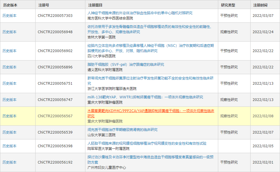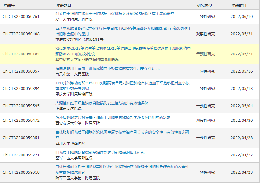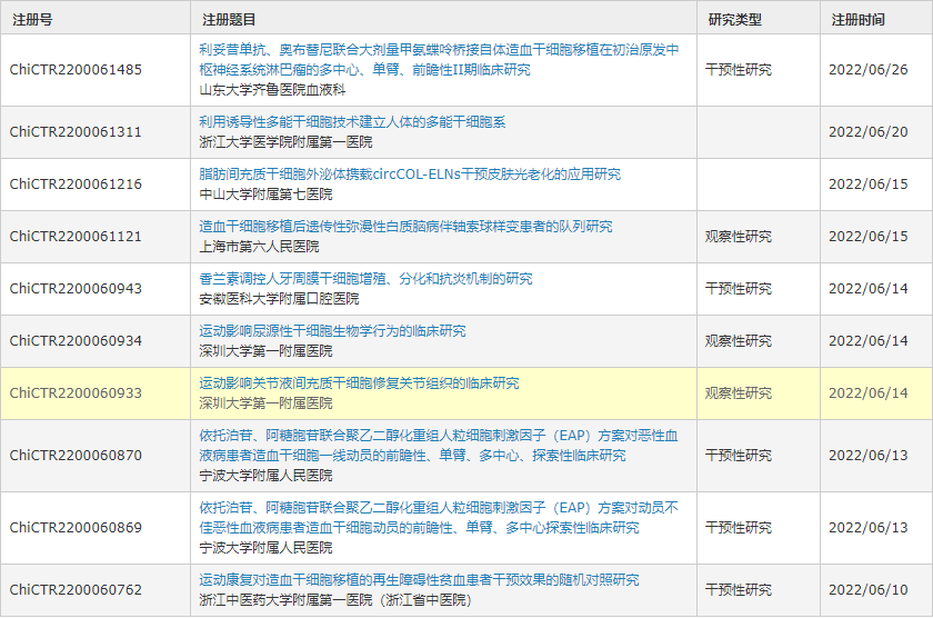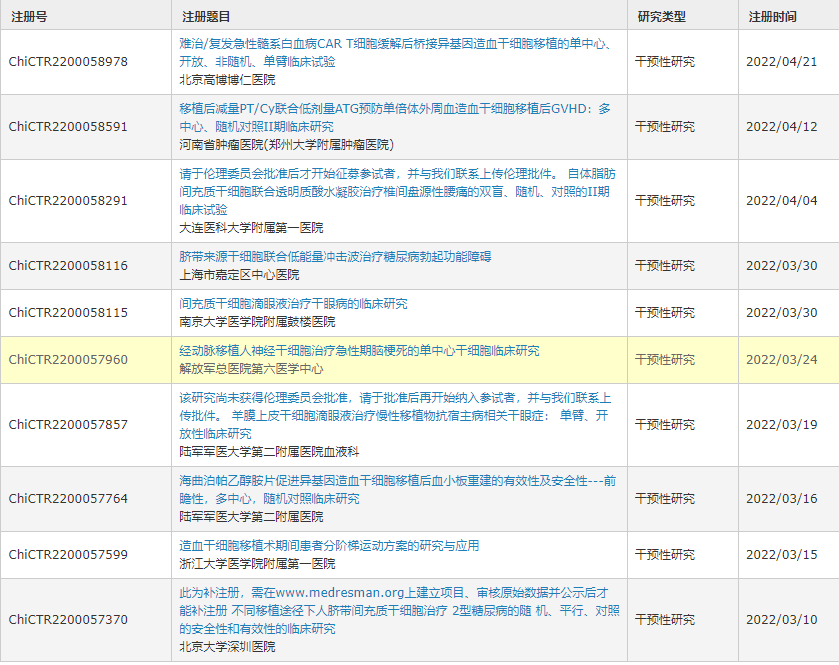 以下是2022年中國干細(xì)胞臨床試驗注冊中心,2022年注冊的臨床項目。