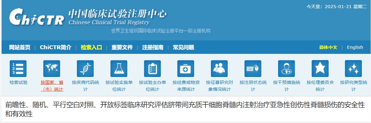 2025年1月20日,西安高新醫(yī)院在《中國臨床試驗(yàn)中心》上注冊了一項(xiàng)關(guān)于“前瞻性、隨機(jī)、平行空白對照、開放標(biāo)簽臨床研究評估臍帶間充質(zhì)干細(xì)胞脊髓內(nèi)注射治療亞急性創(chuàng)傷性脊髓損傷的安全性和有效性”的臨床試驗(yàn)正在招募患者,這一消息無疑為廣大脊髓損傷患者帶來了新的希望!