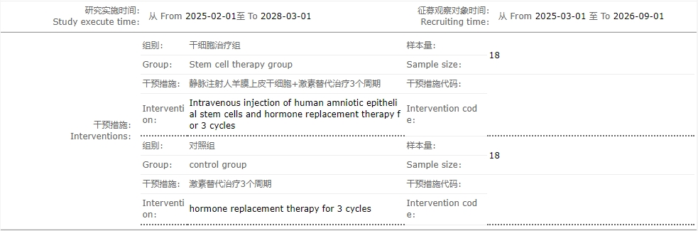 • 干細(xì)胞治療組:靜脈注射人羊膜上皮干細(xì)胞+激素替代治療3個周期