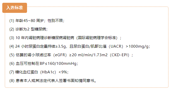 為了讓更多患者受益,本次臨床研究目前正在面向廣大糖尿病腎病患者招募志愿者,具體招募標(biāo)準(zhǔn)如下: