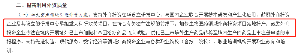 《意見》中的加大重點領(lǐng)域引進外資力度,包含支持外商投資在華設(shè)立研發(fā)中心,與國內(nèi)企業(yè)聯(lián)合開展技術(shù)研發(fā)和產(chǎn)業(yè)化應(yīng)用,鼓勵外商投資企業(yè)及其設(shè)立的研發(fā)中心承擔(dān)重大科研攻關(guān)項目。在符合有關(guān)法律法規(guī)的前提下,加快生物醫(yī)藥領(lǐng)域外商投資項目落地投產(chǎn),鼓勵外商投資企業(yè)依法在境內(nèi)開展境外已上市細胞和基因治療藥品臨床試驗,優(yōu)化已上市境外生產(chǎn)藥品轉(zhuǎn)移至境內(nèi)生產(chǎn)的藥品上市注冊申請的申報程序。支持先進制造、現(xiàn)代服務(wù)、數(shù)字經(jīng)濟等領(lǐng)域外商投資企業(yè)與各類職業(yè)院校(含技工院校)、職業(yè)培訓(xùn)機構(gòu)開展職業(yè)教育和培訓(xùn)。