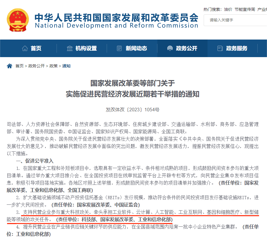 8月1日,國家發(fā)改委等部門聯(lián)合發(fā)布關于實施促進民營經(jīng)濟發(fā)展近期若干舉措的通知,聚焦促進公平準入、強化要素支持、加強法治保障、優(yōu)化涉企服務、營造良好氛圍等5個重要方面,提出28條具體措施。其中在“促進公平準入”方面指出要“支持民營企業(yè)參與重大科技攻關,牽頭承擔工業(yè)軟件、云計算、人工智能、工業(yè)互聯(lián)網(wǎng)、基因和細胞醫(yī)療、新型儲能等領域的攻關任務”。(來源:國家發(fā)改委官網(wǎng))