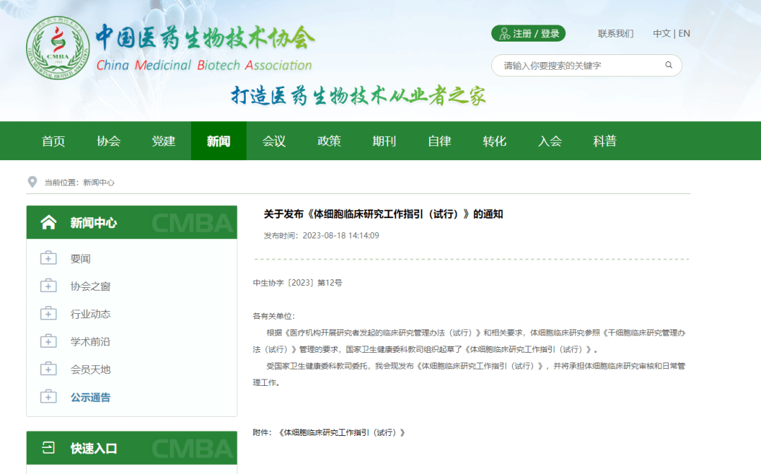 8月18日,中國醫(yī)藥生物技術(shù)協(xié)會發(fā)布《體細胞臨床研究工作指引(試行)》,以促進醫(yī)療機構(gòu)研究者發(fā)起的體細胞臨床研究健康發(fā)展,加強對醫(yī)療機構(gòu)開展體細胞臨床研究工作的指導。(來源:中國醫(yī)藥生物技術(shù)協(xié)會官網(wǎng))