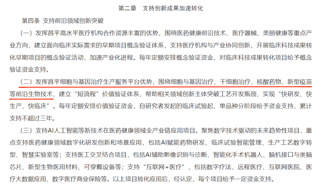 8月1日,北京市昌平區(qū)人民政府印發(fā)《中國(北京)自貿(mào)試驗區(qū)科技創(chuàng)新片區(qū)昌平組團促進醫(yī)藥健康產(chǎn)業(yè)發(fā)展支持辦法》,重點支持包括細胞與基因治療(CGT)在內(nèi)的四大方向,實現(xiàn)細胞與基因治療、干細胞治療等前沿生物技術(shù)及相關領域的創(chuàng)新突破。(來源:昌平區(qū)人民政府官網(wǎng))