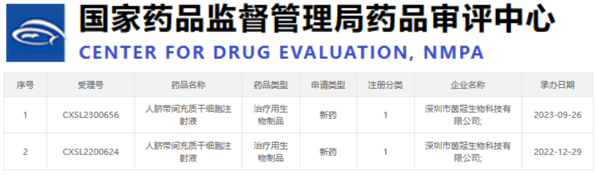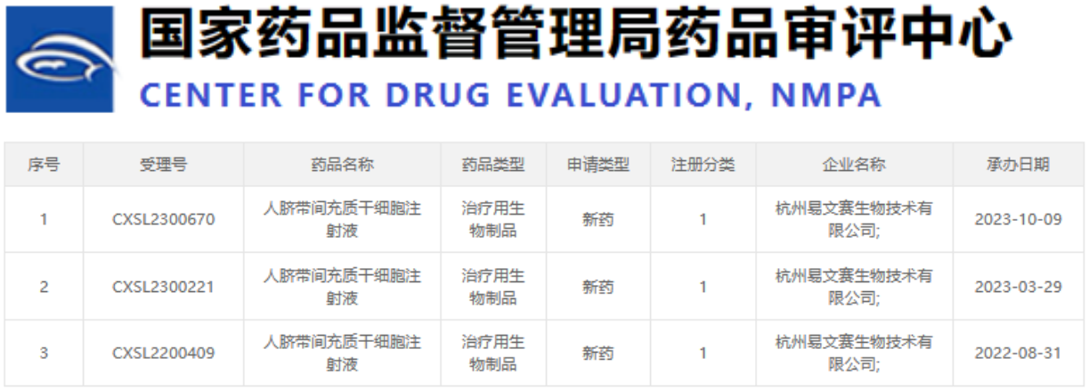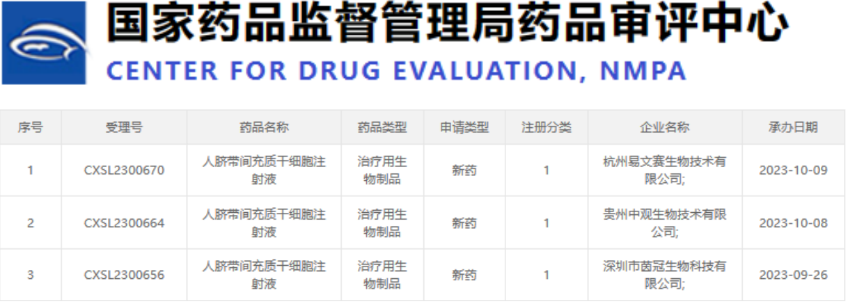 最近,國家藥品監(jiān)督管理局藥品審評中心又公示了三家公司的干細(xì)胞新藥申請,這三家公司分別是深圳市茵冠生物科技有限公司(CXSL2300656)、貴州中觀生物技術(shù)有限公司(CXSL2300664)和杭州易文賽生物技術(shù)有限公司(CXSL2300670)。值得一提的是,這次受理新藥名稱均為“人臍帶間充質(zhì)干細(xì)胞注射液”。