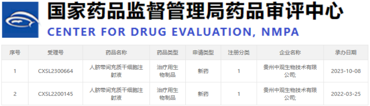 2023年10月8日,貴州中觀生物技術(shù)有限公司獲得了受理批號CXSL2300664,這是該公司的第二款細(xì)胞藥物IND獲受理。早在2022年3月25日,他們的首款“人臍帶間充質(zhì)干細(xì)胞注射液”獲得了CDE默示許可,適應(yīng)癥為膝骨關(guān)節(jié)炎的治療。