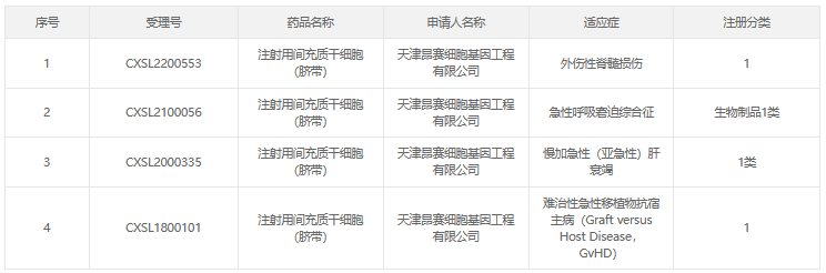 天津昂賽細胞基因工程有限公司成立于2004年,2020年4月獲國家藥監(jiān)局默示許可,其研發(fā)的異基因臍帶間充質(zhì)干細胞藥物進入臨床實驗階段。截止到2023年1月,公司的干細胞產(chǎn)品已有4個適應(yīng)癥獲得國家藥品監(jiān)督管理局藥品審評中心臨床試驗?zāi)驹S可。分別為:外傷性脊髓損傷、急性呼吸窘迫綜合征、慢加急性(亞急性)肝衰竭、難治性急性移植物抗宿主病。