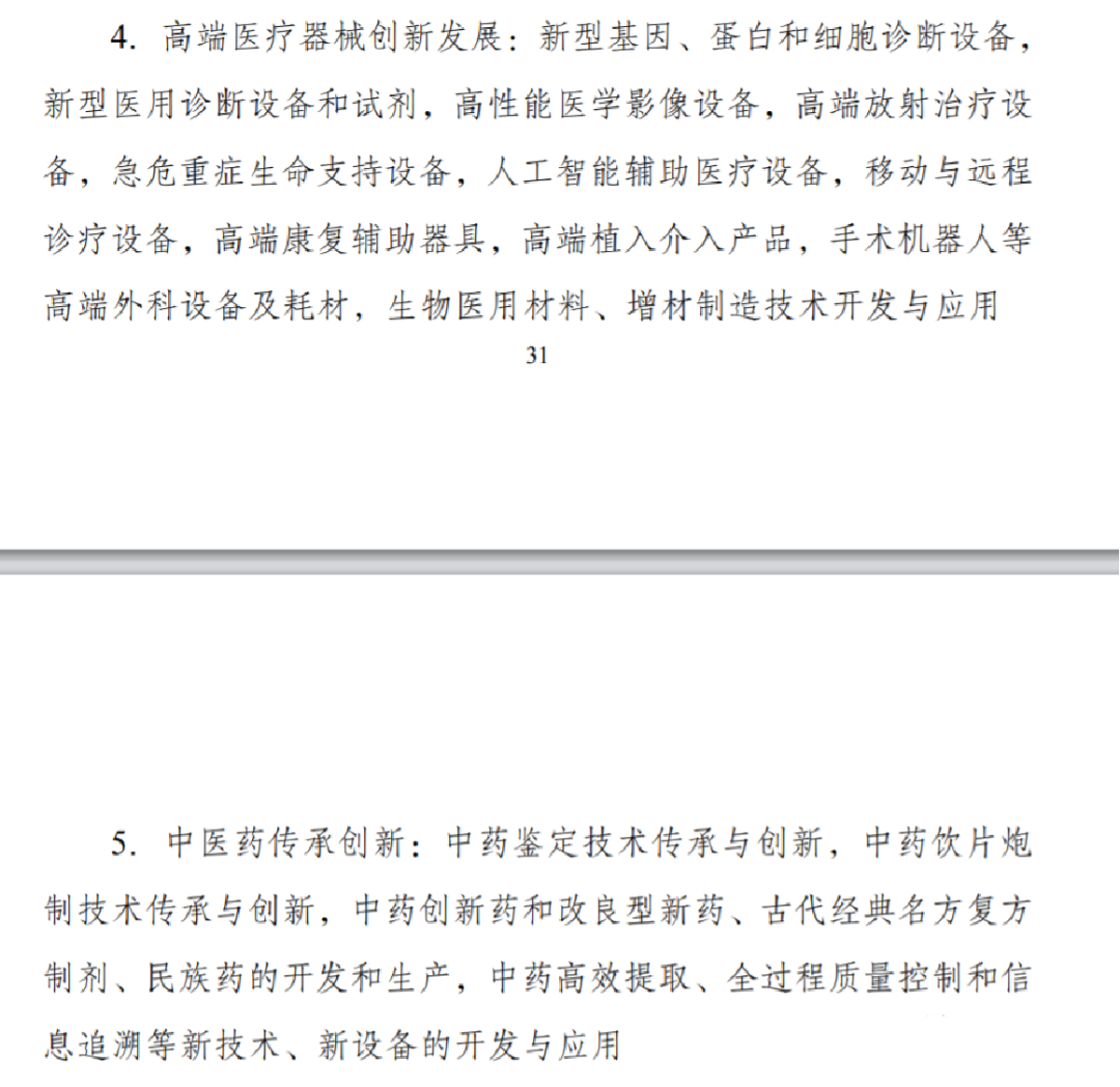 4.高端醫(yī)療器械創(chuàng)新發(fā)展:新型基因、蛋白和細胞診斷設(shè)備,新型醫(yī)用診斷設(shè)備和試劑,高性能醫(yī)學影像設(shè)備,高端放射治療設(shè)備,急危重癥生命支持設(shè)備,人工智能輔助醫(yī)療設(shè)備,移動與遠程診療設(shè)備,高端康復輔助器具,高端植入介入產(chǎn)品,手術(shù)機器人等高端外科設(shè)備及耗材,生物醫(yī)用材料、增材制造技術(shù)開發(fā)與應(yīng)用