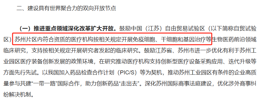 作為全球生物醫(yī)藥的前沿方向,免疫細(xì)胞治療、干細(xì)胞再生醫(yī)學(xué)和基因治療近年來備受關(guān)注。商務(wù)部此次明確提出支持符合資質(zhì)的醫(yī)療機(jī)構(gòu)按照相關(guān)規(guī)定開展這些技術(shù)的臨床研究,并對研究者發(fā)起的臨床研究給予政策鼓勵。這不僅降低了前沿技術(shù)從實驗室走向臨床的門檻,也為廣大從業(yè)者提供了更多探索未知領(lǐng)域的空間。這一政策利好,不僅僅是對蘇州工業(yè)園區(qū)的支持,更體現(xiàn)出我國在生物醫(yī)藥領(lǐng)域的全面布局。從頂層設(shè)計的高度出發(fā),政策目標(biāo)直指全球生物醫(yī)藥技術(shù)的競爭前沿,意在打造中國生物醫(yī)藥技術(shù)和產(chǎn)業(yè)的“硬核力量”。