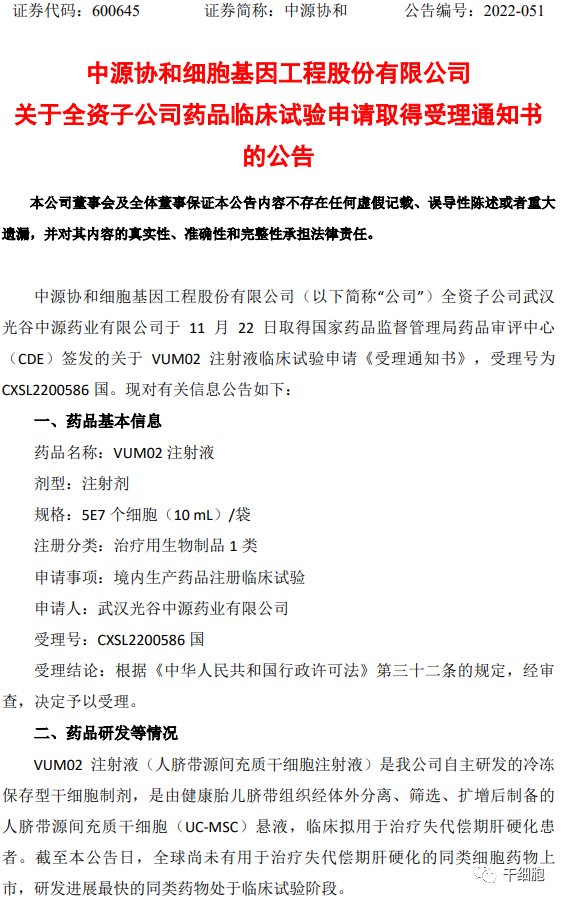 中源協(xié)和細(xì)胞基因工程股份有限公司(以下簡(jiǎn)稱“公司”)全資子公司武漢光谷中源藥業(yè)有限公司于11月22日取得國(guó)家藥品監(jiān)督管理局藥品審評(píng)中心(CDE)簽發(fā)的關(guān)于VUM02注射液臨床試驗(yàn)申請(qǐng)《受理通知書(shū)》,受理號(hào)為CXSL2200586 國(guó)?,F(xiàn)對(duì)有關(guān)信息公告如下: