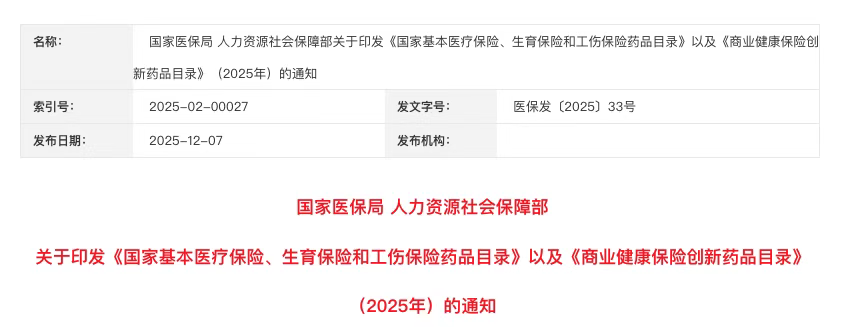 12月7日,國(guó)家醫(yī)保局在廣州正式發(fā)布《國(guó)家基本醫(yī)療保險(xiǎn)、生育保險(xiǎn)和工傷保險(xiǎn)藥品目錄(2025年版)》以及首份《商業(yè)健康保險(xiǎn)創(chuàng)新藥品目錄》。