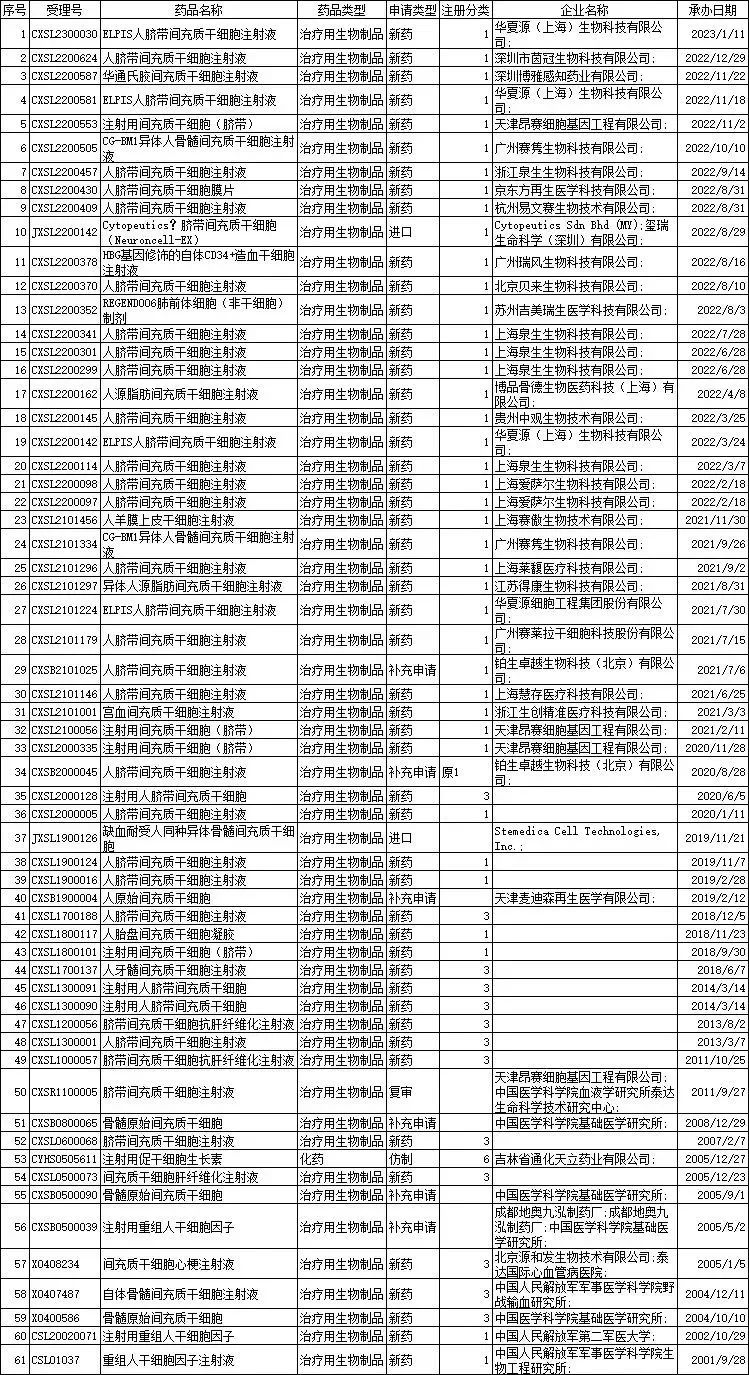 獲得國(guó)家藥品監(jiān)督管理局藥物臨床試驗(yàn)批準(zhǔn)的干細(xì)胞項(xiàng)目61項(xiàng)(結(jié)止2023年1月)